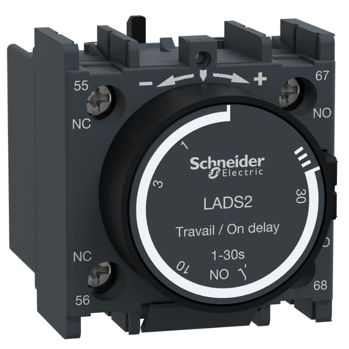 TeSys Deca bloque de contacto auxiliar de retraso de tiempo, para contactores LC1D, LC1F y relés de control CAD. Proporciona contactos 1NO + 1NC con potencia nominal de hasta 10A 690V CA, rango de ajuste de retraso 1-30s,conexión por terminales de abrazaderas de tornilloSe garantiza un retraso de 40 ms entre la apertura del contacto NC y el cierre del contacto NO.